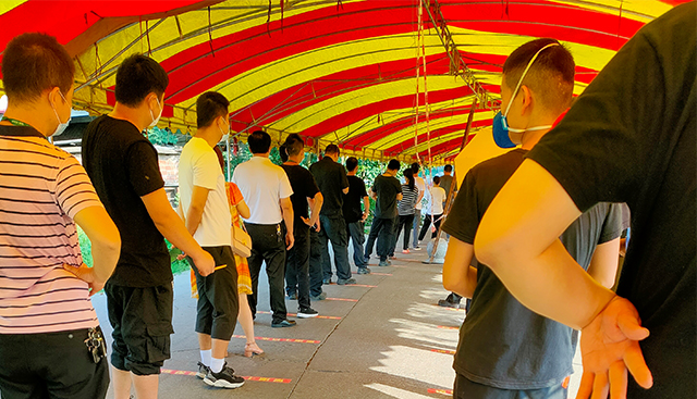 按照防疫指引,實(shí)行員工錯(cuò)位就餐。為確保疫情期間用餐安全,公司實(shí)行疫情期錯(cuò)峰就餐原則,員工進(jìn)入食堂、排隊(duì)打餐需全程佩戴口罩,用餐時(shí),一桌不超過(guò)兩人,采取每桌2人斜對(duì)角落座的方式就坐。