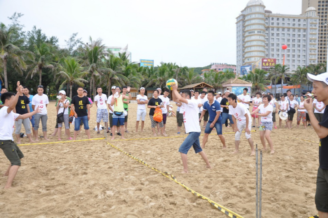 我們在黃金海岸舉行了沙灘排球、拔河、兩人雙足等眾多有利于團建的沙灘娛樂活動??纯次覀兊纳碁┡徘蛘l更厲害,首先姿勢要擺對,聽我口哨準備發(fā)球啦!啦啦隊們?yōu)槲覀兊木时荣惡炔剩?/span>