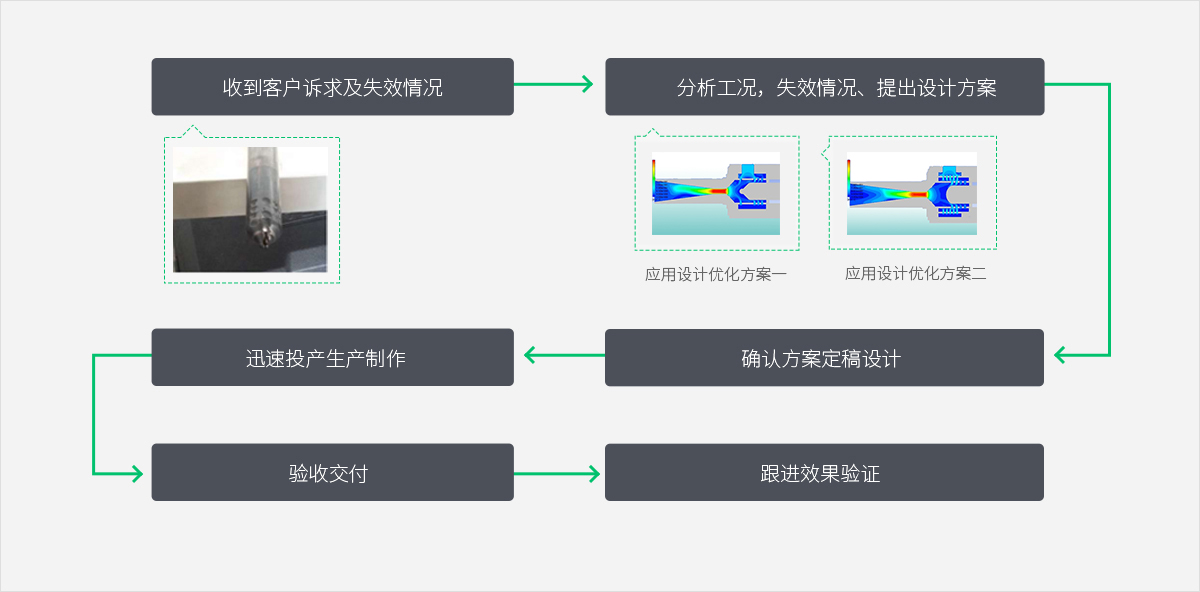收到客戶訴求及失效情況 → 分析工況,失效情況、提出設(shè)計方案 → 應(yīng)用設(shè)計優(yōu)化方案 → 確認(rèn)方案定稿設(shè)計 → 迅速投產(chǎn)生產(chǎn)制作 → 驗收交付 → 跟進(jìn)效果驗證
